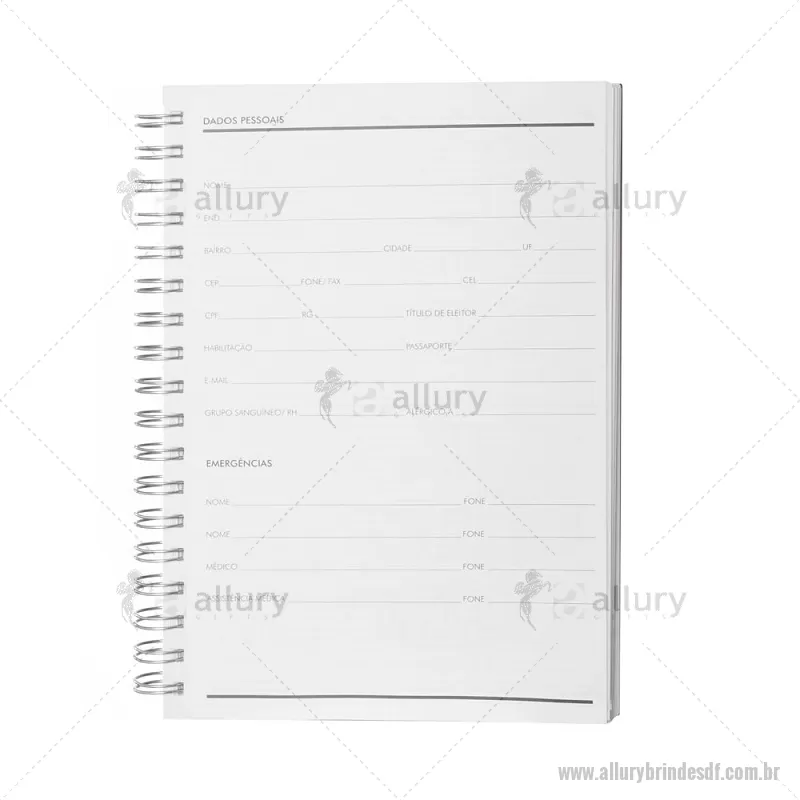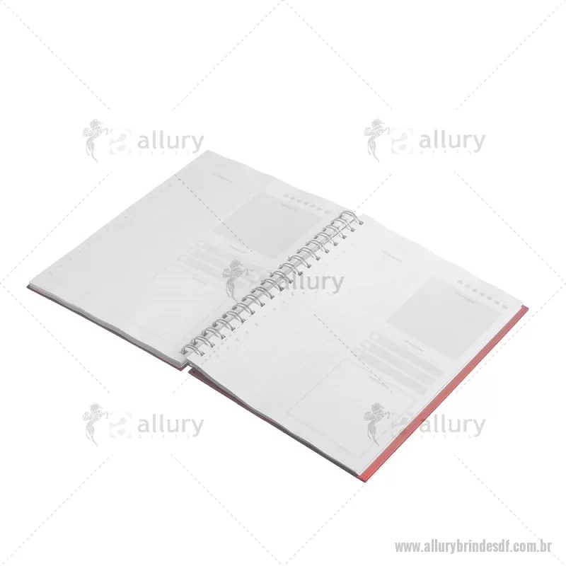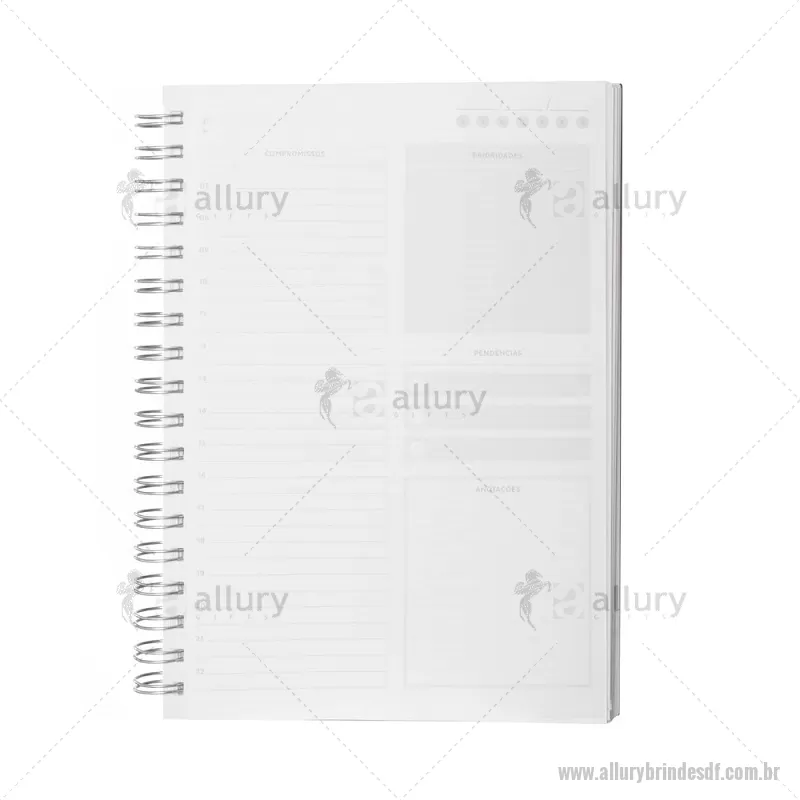 Caderno planner em espiral com capa rígida em Percalux de 2 mm. Possui 90 folhas brancas de 95 g/m² com layout de planner, ideais para organização e controle da rotina. Inclui páginas de dados pessoais, calendários de 2025 a 2028 e espaços para anotações mensais. - - ALLDFCAD034