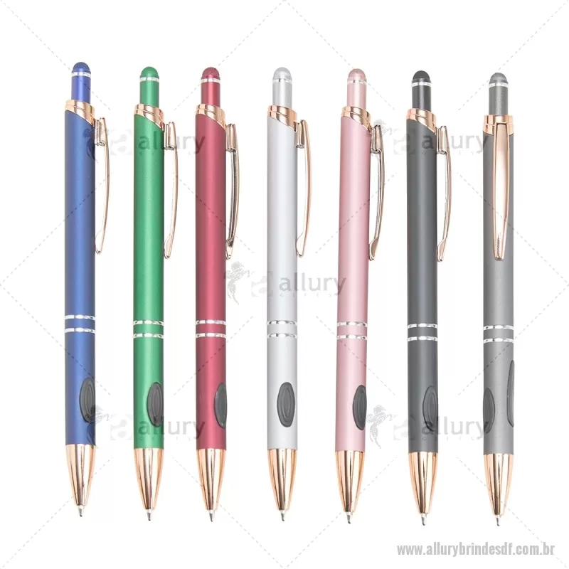 Caneta Metal Touch A elegância e o conforto combinados em uma única caneta esferográfica para garantir uma escrita mais agradável através da sua construção metálica e seu par de grips em borracha, além de ponta e clipe em plástico. Sua carga azul de 1.0 mm possui acionamento por clique com ponteira emborrachada que que permite seu uso como uma caneta touch para interação com smartphones, tablets e demais dispositivos de telas touchscreen. Largura : 1,5 cm x Circunferência : 4,5 cm x Comprimento : 14 cm Peso aproximado (g): 17 - - ALLDFCMT293