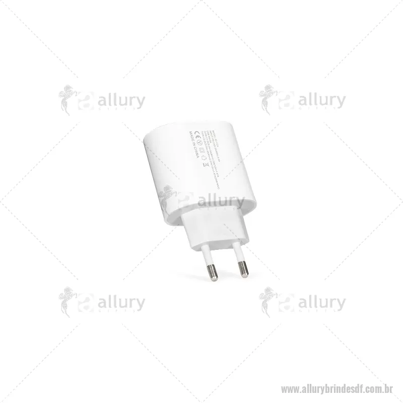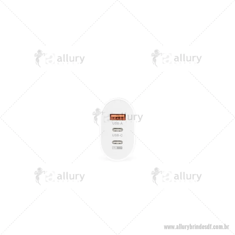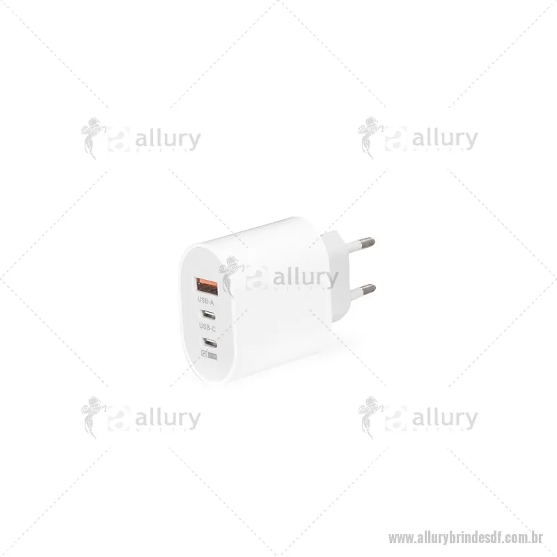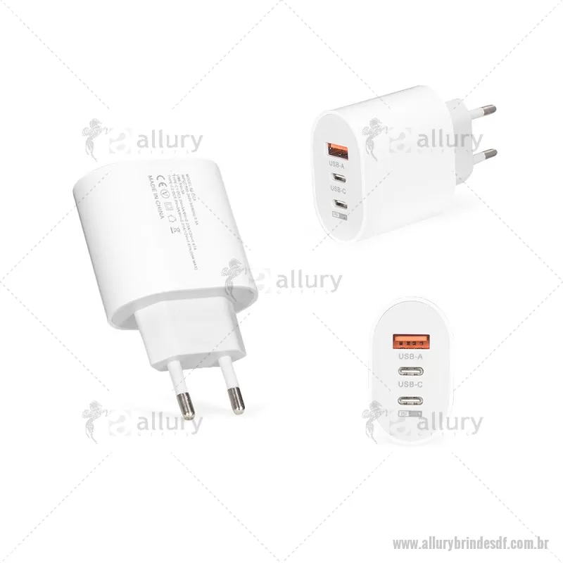 Carregador rápido em plástico leve e compacto, com três portas: uma USB-A e duas USB-C, incluindo uma opção de carregamento rápido de 20W. Ideal para recarregar diferentes dispositivos com praticidade. Cabo USB não incluído. - - ALLDFTEC535