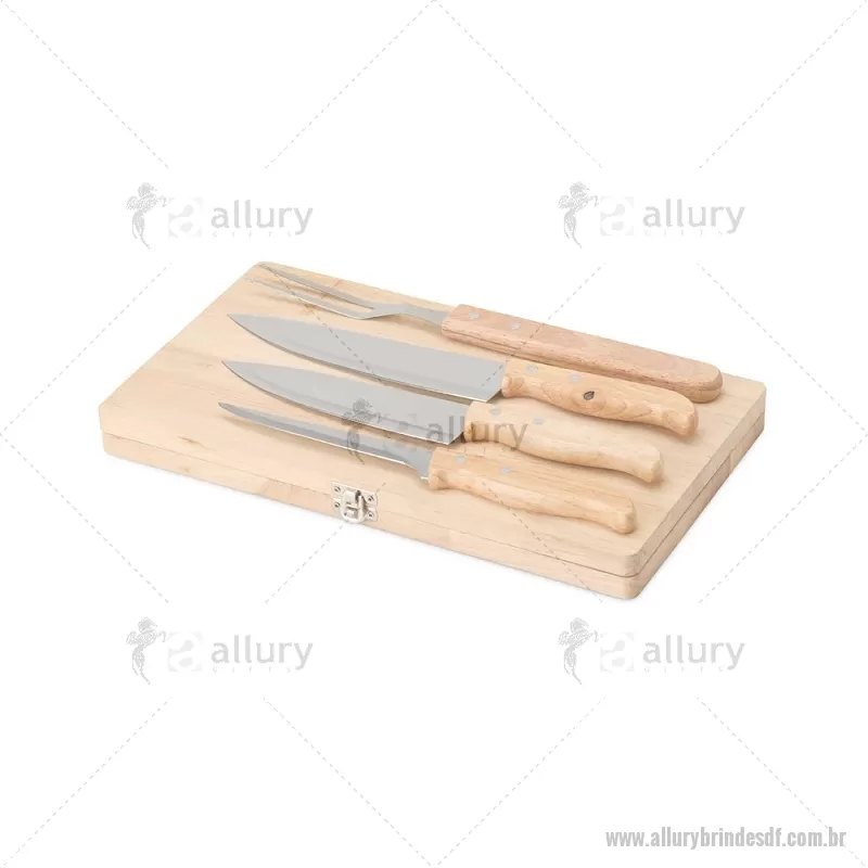 Kit Churrasco com 4 Peças e Estojo de madeira. Brinde ideal para quem curte passar o fim de semana cercado da família e amigos. Kit churrasco 4 peças em estojo de madeira. Contém três facas e um garfo. Altura : 3 cm x Largura : 35,4 cm x Profundidade : 19,8 cm Peso aproximado (g): 1449 - - ALLDFKCH040