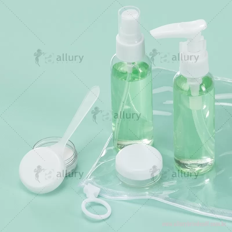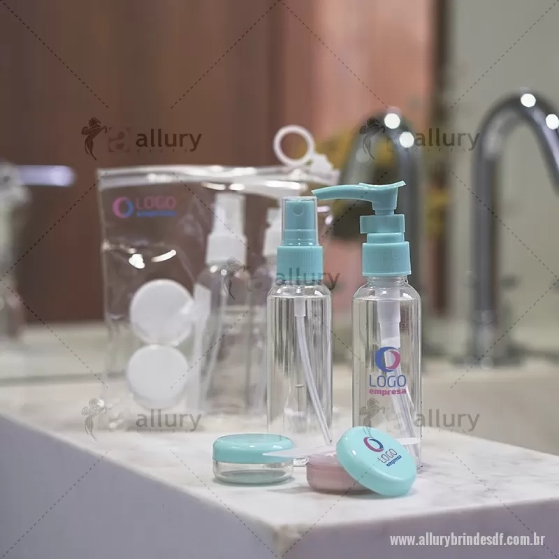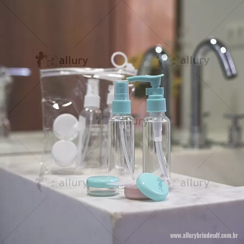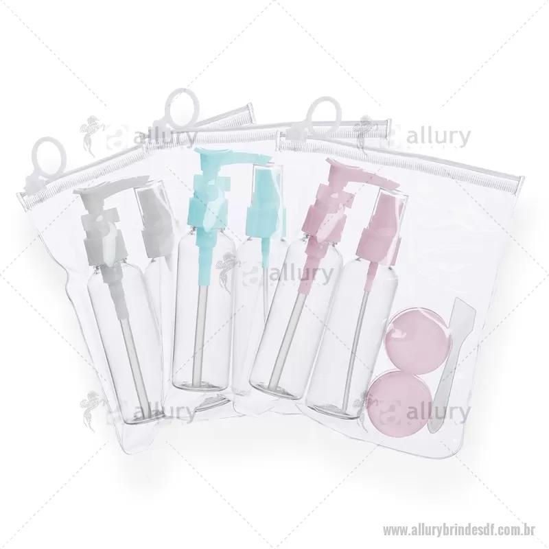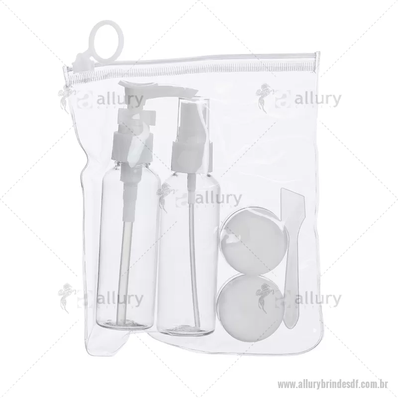 Kit Viagem 5 Peças Descrição: Kit viagem 5 peças em estojo ziplock. Contém frasco de 70ml com tampa spray; frasco de 70 ml com tampa pump; 2 potes de 10ml com tampa rosqueável e mini espátula fosca. Frascos plásticos e estojo em pvc com puxador plástico. Altura : 17,2 cm x Largura : 14,5 cm Peso aproximado (g): 61 - - ALLDFKVG017