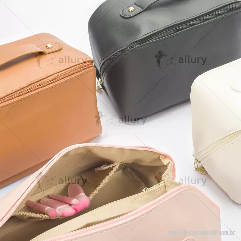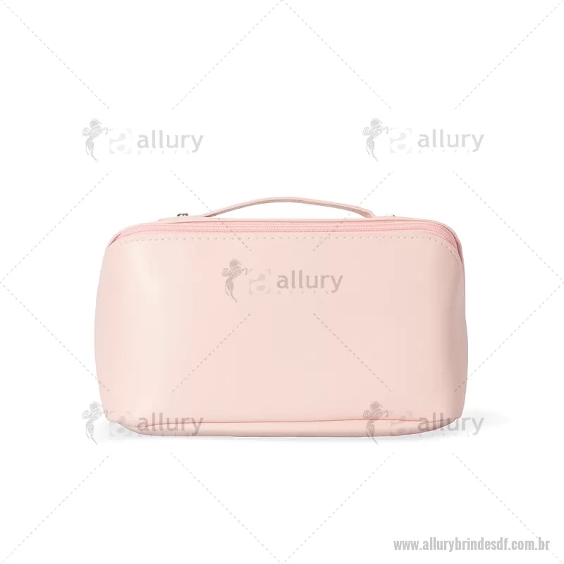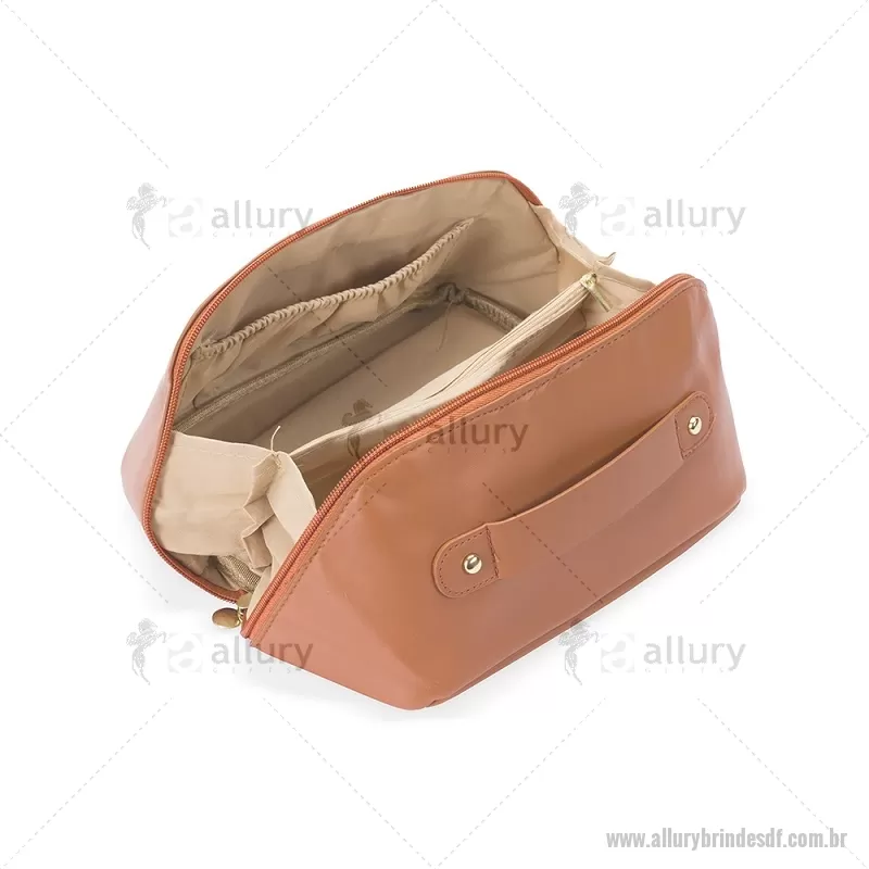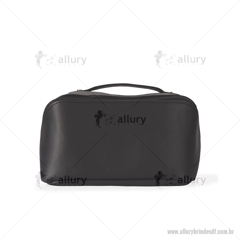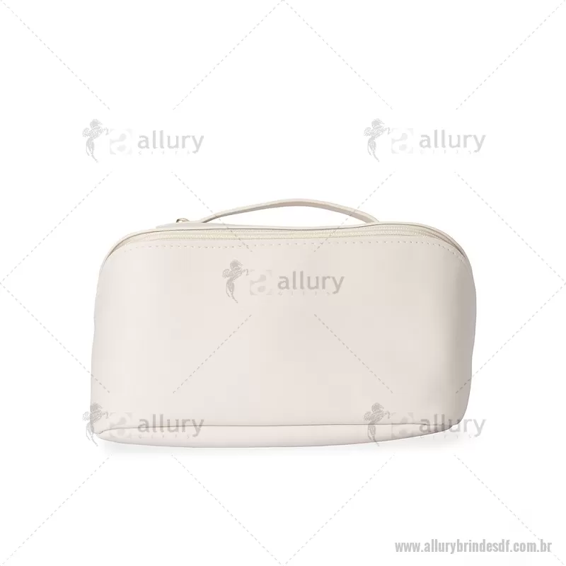 Nécessaire em PU impermeável com abertura em 180 graus, estilo concha, oferecendo fácil visualização dos itens. Possui compartimento interno amplo com dois bolsos laterais e um bolso central com zíper, além de alça para transporte. Ideal para organizar acessórios e produtos pessoais. - - ALLDFNC146