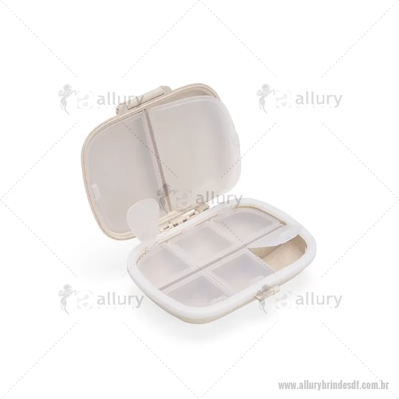 Porta-Comprimidos Plástico Porta-comprimidos compacto feito em plástico obtido da palha de trigo e anel de vedação para as bordas em silicone. Possui oito compartimentos com tampas removíveis, sendo dois maiores com capacidade de até 30ml e seis menores com até 10ml cada. Acompanha palheta multiuso. Largura : 8,6 cm x Espessura : 3,6 cm x Comprimento : 11 cm Peso aproximado (g): 72 - - ALLDFPCP016