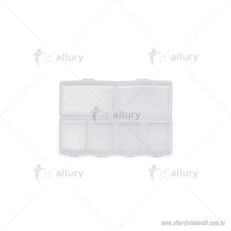 Porta-Comprimidos Plástico Descrição: Porta-comprimidos em plástico com seis compartimentos, dois maiores e outros quatro menores, oferecendo mais possibilidades de organização. Largura : 6,4 cm x Espessura : 1,9 cm x Comprimento : 9,5 cm Peso aproximado (g): 23 - - ALLDFPCP015