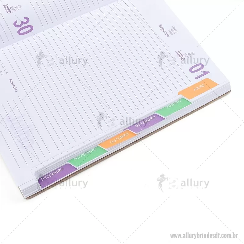 Agenda 2024 de couro sintético com abas mensais e marcador de página em cetim. Contém folhas para dados pessoais, calendários 2024 à 2026, planejamento 2024, DDI, página de conversões e páginas de contatos. - - ALLDFAGE024