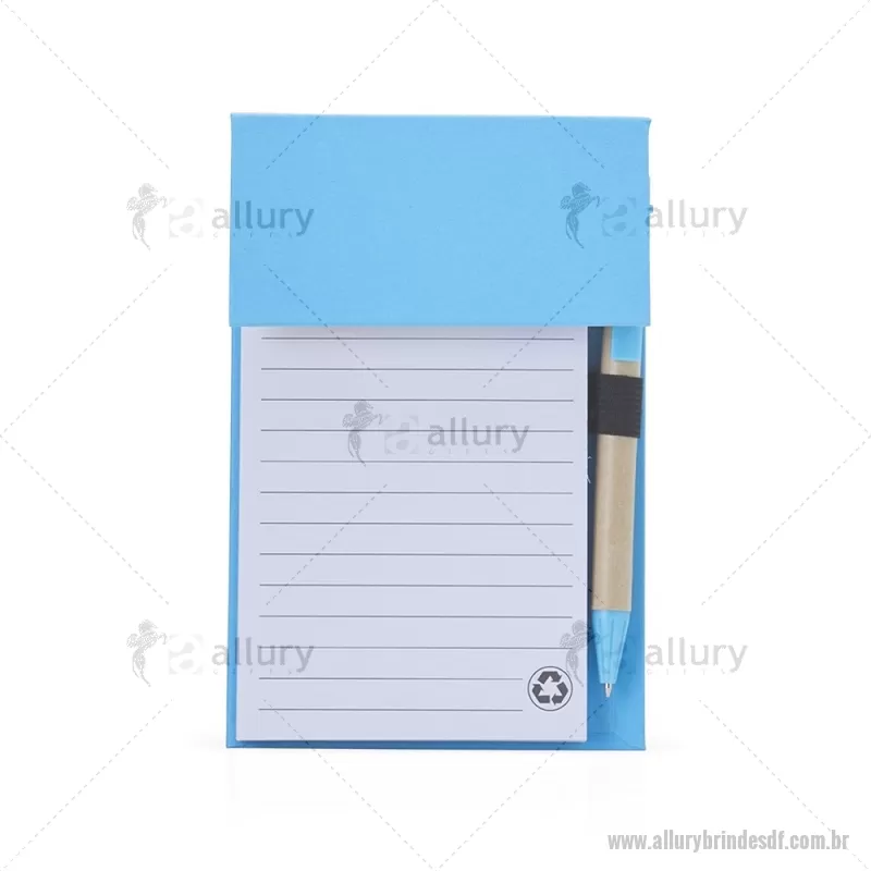 Bloco de anotações ecológico com caneta, feito em kraft com 6 blocos autoadesivos coloridos com aproximadamente 20 folhas e bloco com aproximadamente 100 folhas brancas com pauta. Possui porta caneta elástico e acompanha caneta de papelão e detalhes plásticos, carga esferográfica azul 1.0mm e acionamento por clique. Altura : 15,7 cm x Largura : 10,6 cm x Espessura : 1,8 cm Tamanho total aproximado (CxL): Caneta - 13,8 cm x 1,4 cm Peso aproximado (g): 134 - - ALLDFBLC215