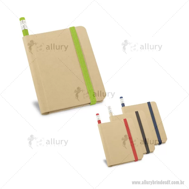 Bloco A7 com 70 folhas não pautadas de papel reciclado, capa dura em cartão e elástico. Incluso lápis com borracha na ponta. 8,2 x 10,5 cm - - ALLDFBLC187