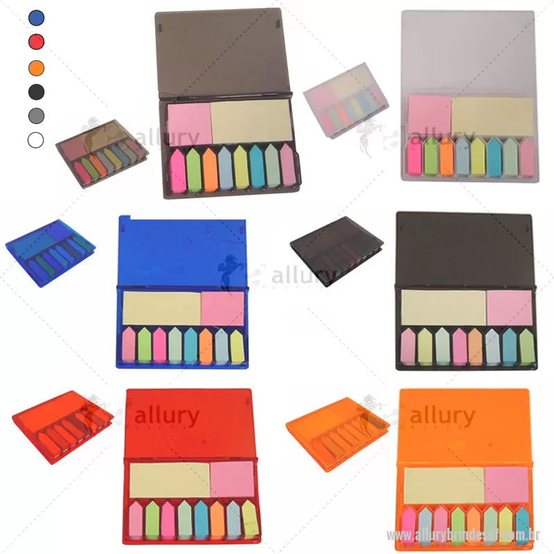 Bloco de anotações auto colante personalizado. Contém: um bloco amarelo com 96 folhas (7,5 x 4,5 cm), um bloco de recados rosa 96 folhas (4 x 4,5 cm) e mais 800 post it coloridos, sendo 100 de cada cor (pink, laranja, verde florescente, azul, amarelo, rosa, verde claro e azul claro). Estojo translúcido. Consultar cores disponíveis. Ótima opção para brindes promocionais e eventos corporativos. - - ALLDFBLC021