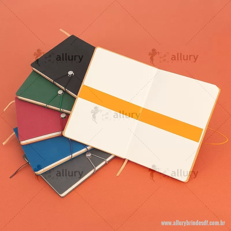 Caderneta com fecho de pino e elástico de nylon para lacre. Capa em material sintético emborrachado, possui aproximadamente 96 folhas pardas pautadas e marca página em cetim. Tamanho total aproximado (CxL): 21 cm x 14,8 cm x 2,2 cm Peso aproximado (g): 302 - - ALLDFBLC220
