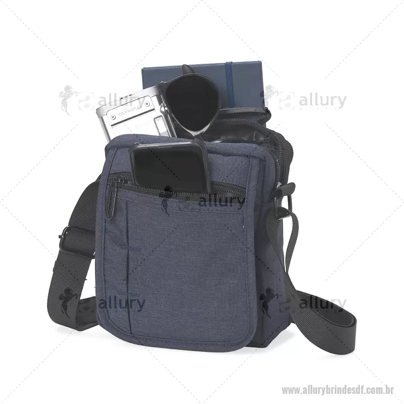 Bolsa de ombro em nylon com quatro compartimentos. Possui quatro compartimentos e uma alça de uso transversal.