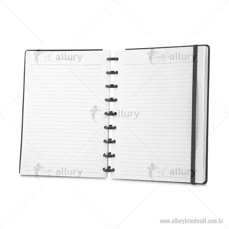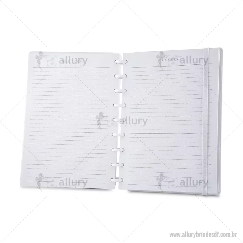 Caderno de anotações com folhas removíveis, capa dura cartonada revestida em material sintético, 80 folhas pautadas 75 g/m², calendário anual, manual de instruções, bolso plástico interno para documentos e elástico para fechamento seguro. Peso do Produto: 0,354kg Dimensão do Produto: 23,5x18cm - - ALLDFCAD035