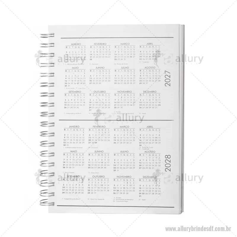 Caderno planner em espiral com capa rígida em Percalux de 2 mm. Possui 90 folhas brancas de 95 g/m² com layout de planner, ideais para organização e controle da rotina. Inclui páginas de dados pessoais, calendários de 2025 a 2028 e espaços para anotações mensais. - - ALLDFCAD034