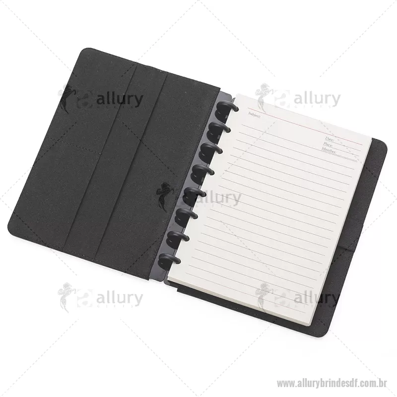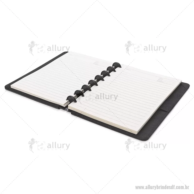 Caderno de anotações com capa dura em material sintético, contendo: Miolo de 80 folhas pautadas na cor bege; Porta Canetas; Porta Cartões; Obs.: As folhas do miolo são destacáveis. Dimensão do produto: 22,3x18,0x2,1cm (AxLxP) Peso do Produto: 0,438kg - - ALLDFCAD025