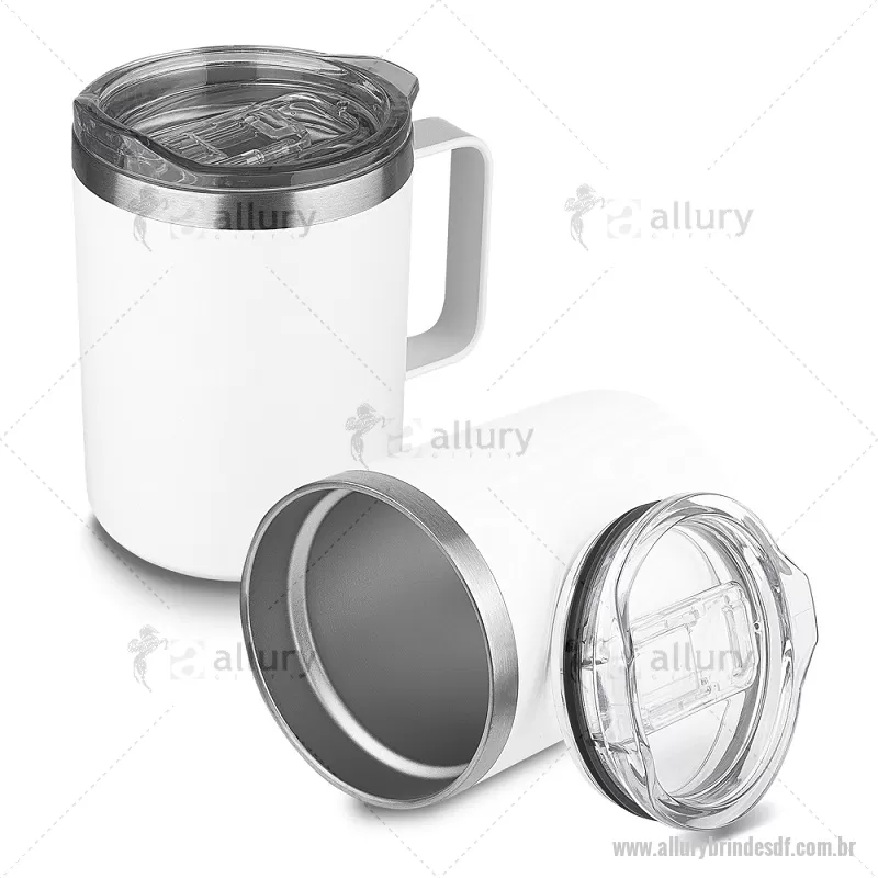 Caneca térmica em aço inox com parede dupla isolada à vácuo, tampa plástica e anel em silicone para vedação, alça lateral. Capacidade 350ml. - - ALLDFCAN082