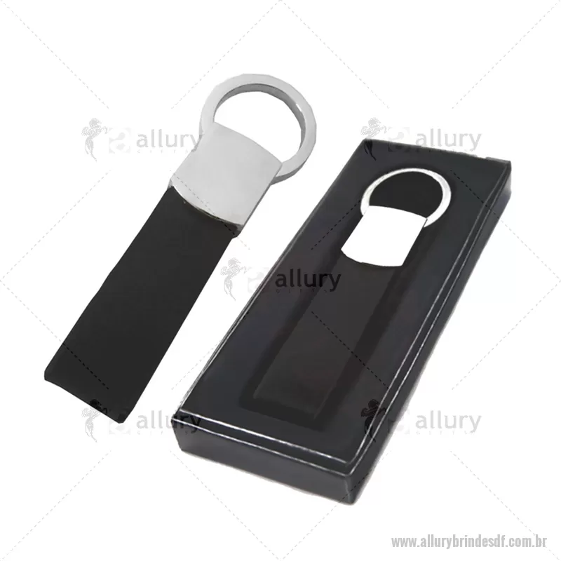 Chaveiro de metal com detalhe de couro sintético com embalagem de papelão. Personalizado - - ALLDFCHV009