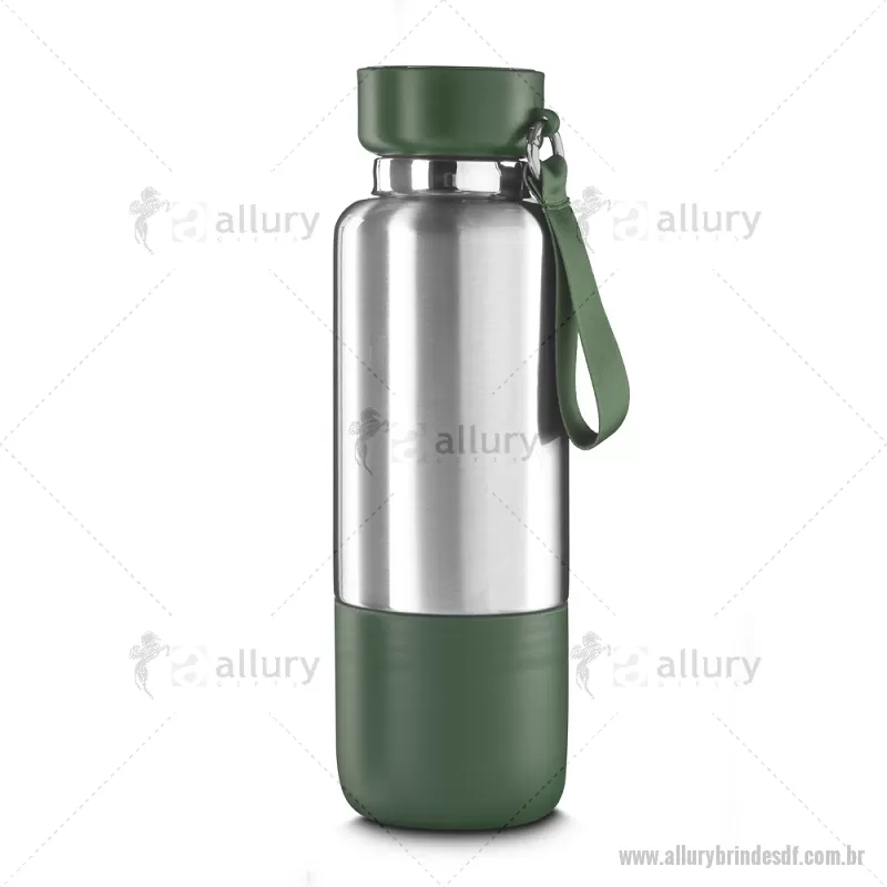 Garrafa térmica em aço inox com parede dupla isolada a vácuo, capacidade de 500ml e cordão tipo mosquetão. Tampa rosqueável, vedada por um anel de silicone. Possui copo adicional rosqueável na parte inferior da garrafa. Parte superior da tampa acompanha um cordão adicional de 68cm para substituição. Permitindo uso do compartimento para pequenos objetos. - - ALLDFGAT114