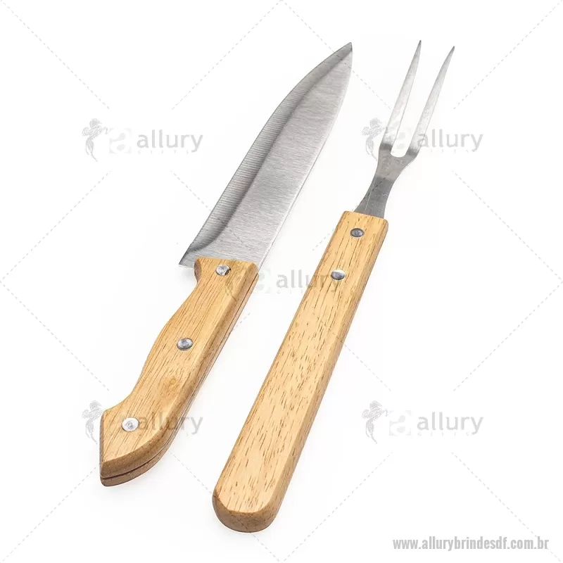 Vai um churrasquinho aí? Mas antes, não podemos esquecer de quem torna tudo isso possível, o kit do(a) churrasqueiro(a). Com 2 peças: garfo e faca de inox, com cabo de madeira, protegidos em uma embalagem de kraft. Melhore o que já é bom com este kit ideal para churrascos! Altura : 3,5 cm x Largura : 5 cm x Comprimento : 33,8 cm Características Técnicas Medidas Faca (C x L): 32,5 cm x 3,8 cm Medidas Garfo (C x L): 31,5 cm x 2,5 cm Peso aproximado (g): 215 - - ALLDFKCH085