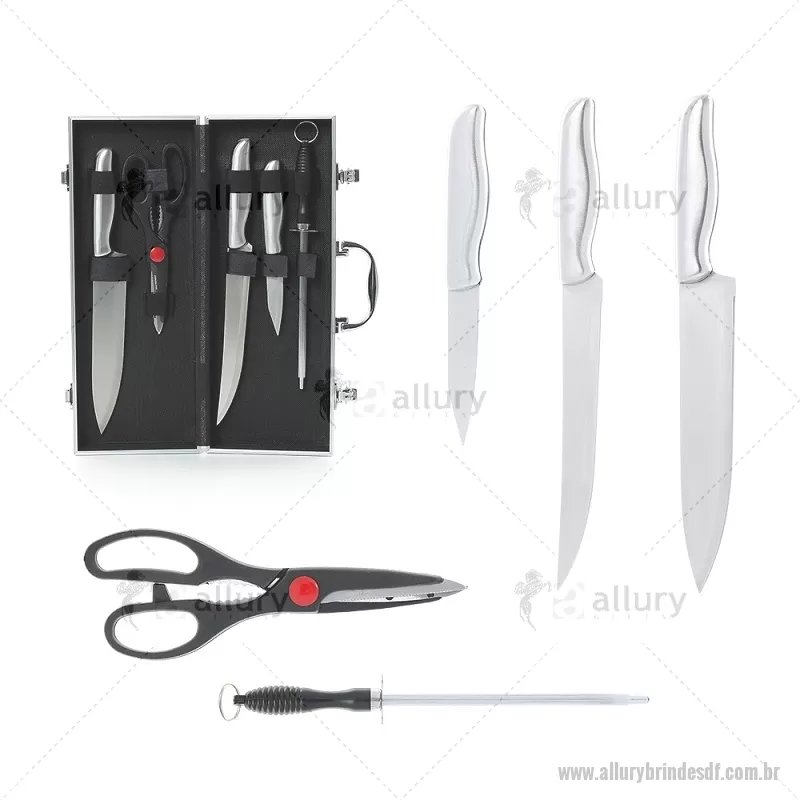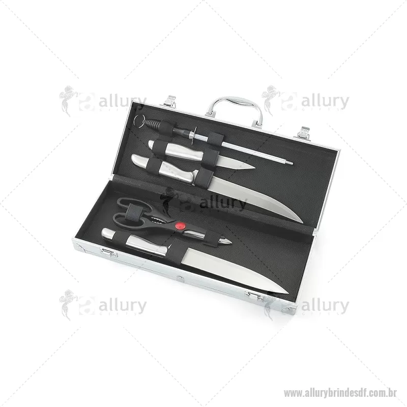 Kit churrasco 5 peças em maleta de alumínio com travas de segurança, contém três facas de corte, tesoura e chaira. Parte interna da maleta com revestimento em tnt e suportes de velcro para fixação das peças. Altura : 13,5 cm x Espessura : 6 cm x Comprimento : 36,5cm - - ALLDFKCH080