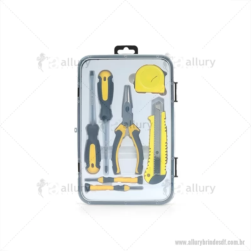 kit ferramentas 7 peças em estojo plástico com trava de segurança. Acompanha chaves Philips e fenda com ponteira magnética, trena de 2 metros, estilete, alicate e duas chaves de precisão, Philips e fenda. - - ALLDFFER059
