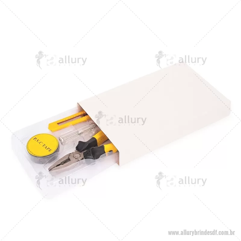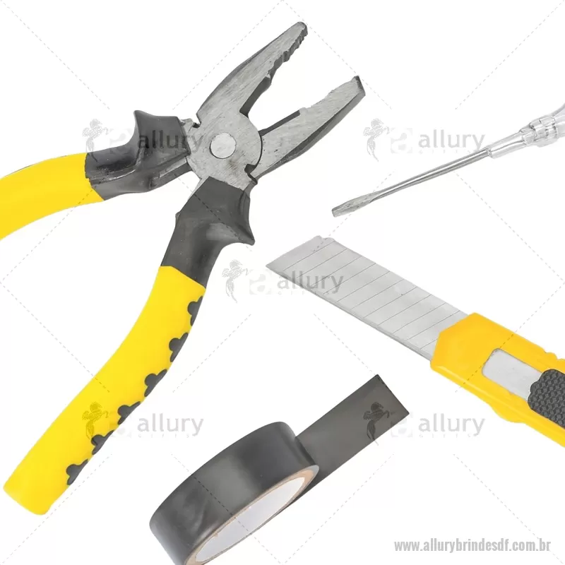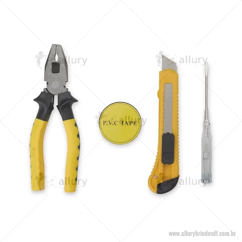 Kit de ferramentas compacto para uso diário, composto por chave de fenda teste, estilete, alicate e fita PVC. Todas as peças possuem acabamento em plástico resistente, oferecendo praticidade, conforto e durabilidade para pequenos reparos e imprevistos do dia a dia. - - ALLDFFER066