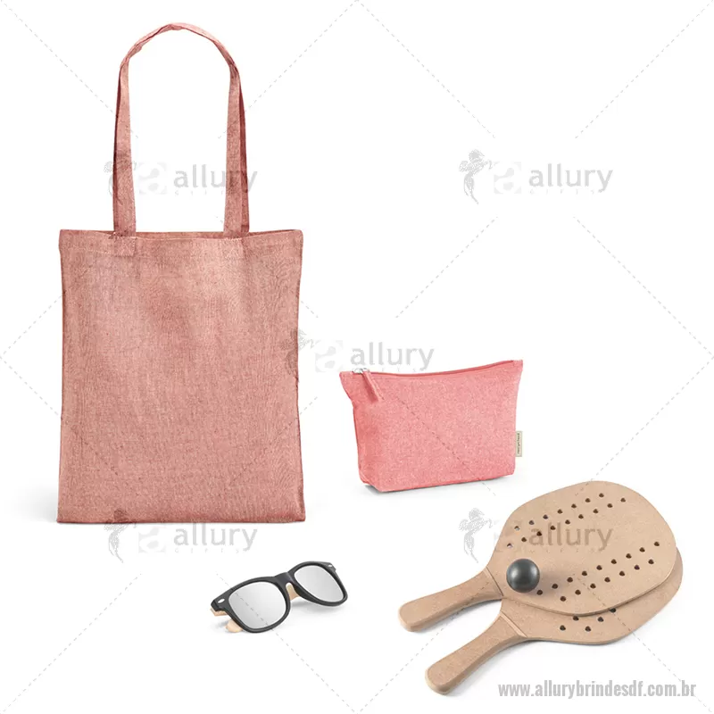 Kit Praia com 4 peças 1 Sacola dobrável em 70% algodão reciclado e 30% poliéster reciclado (140 g/m²) sem tingimento. medidas: 375 x 415 mm (SAC039) gravação silk 1 cor 1 Nécessaire multifunções em 70% algodão reciclado e 30% poliéster reciclado (140 g/m²). Interior com forro 100% algodão. medidas: 250 x 140 x 60 mm (NC133) gravação silk 1 cor 1 Kit de raquetes de frescobol. Raquetes de praia em MDF com bola inclusa. Fornecidas individualmente num saco em 100% algodão. medidas: 330 x 190 x 8 mm (LPR028) gravação laser nas duas raquetes 1 . Óculos de sol com armação em PP e bambu. Lentes espelhadas de categoria 3 e UV400 de proteção. Em conformidade com as normas EN ISO 12312-1. A cor e o resultado da impressão nos materiais naturais pode variar entre produtos. medidas: 146 x 49 x 150 mm (OCL003) gravação tampo nas 2 hastes - - ALLDFLPR030