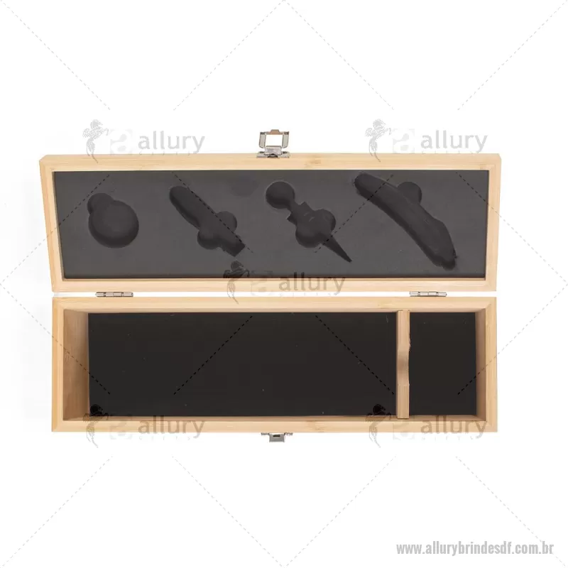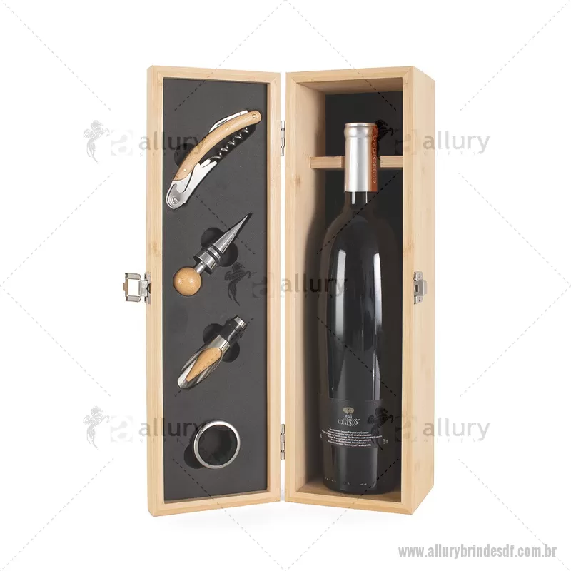 Kit Vinho em bambu com interior em EVA e fecho em inox, suporte para garrafa de vinho de 750 ml (padrão). Contém: saca-rolha de metal com detalhes em bambu e cortador de lacre, anel corta-gotas de metal, bico para servir de metal com tampa em bambu e tampa de metal com detalhe em bambu. Peso do Produto: 0,997kg Dimensão do Produto: 11x36x11cm *Não acompanha garrafa vinho, imagem meramente ilustrativa. - - ALLDFKVI051