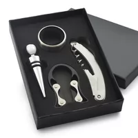 Kit vinho 4 Peças em maleta de couro sintético com duas repartições para garrafas. Contém saca-rolhas metálico, bico condutor com tampa, cortador de lacre e wine collar. Maleta com alça e trava de segurança, área interna revestida de veludo com suporte em couro sintético e velcro em cada repartição para fixação das garrafas. Altura : 11,8 cm x Largura : 19,9 cm x Comprimento : 34,3 cm Peso aproximado (g): 1094 - - ALLDFKVI044