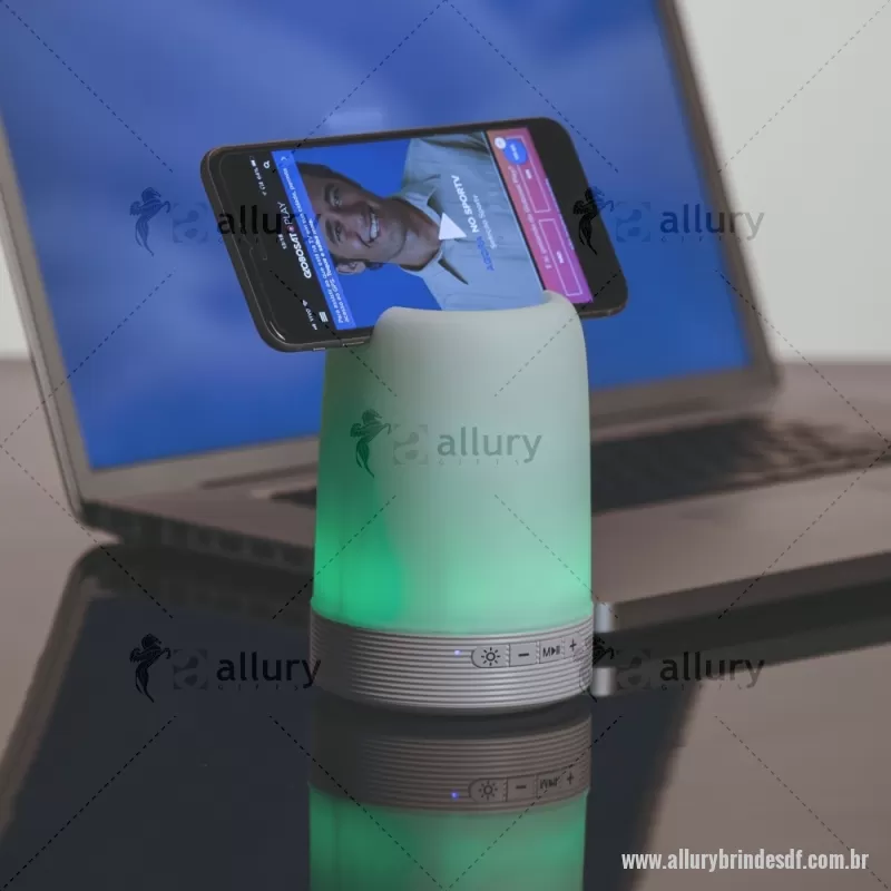 Caixa de som multimídia com luzes, suporte para celular e porta caneta. Material plástico resistente na cor branca fosca, parte superior com falante vazado na área interna, pode ser utilizado como porta caneta ou suporte para celular. Parte inferior branca leitosa com linhas em relevo, borracha inferior antideslizante e alça de alumínio. Possui: Entrada para cartão MicroSD; Entrada DC 5V; Entrada Auxiliar/P2; Botão Off/On; Entrada USB; Luz led indicando funcionamento; Botão ☼ luzes; Botão -; Botão Mode; Botão +; Microfone; Falante 4 Ω 5W; Potência de saída 5W*1; Bateria 1200mAh, Duração aproximada 3 À 4 horas; Acompanha cabo USB. - - ALLDFTEC289