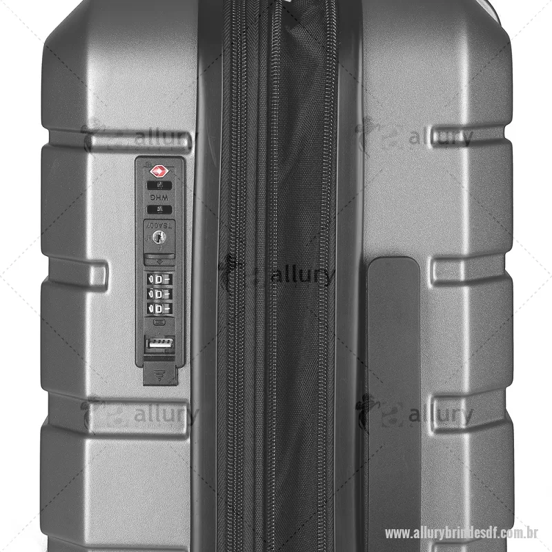 Mala de viagem em policarbonato. Abertura frontal com ziper para acesso ao interior da mala; Sistema de carrinho de aço; Alça de mão na lateral e na parte superior; Quatro rodas de 360 graus; Cadeado tipo TSA ; Saída USB. Expansor prático aumentando o espaço interno; - - ALLDFMC202