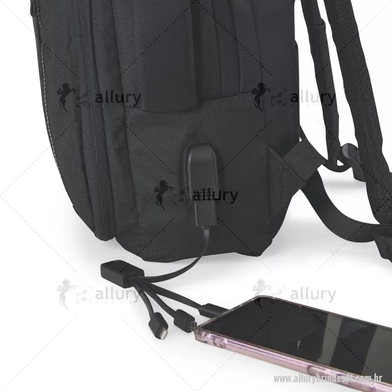 Mochila confeccionada em Nylon, 21 litros, com 4 compartimentos, sendo o principal com bolso para notebook de 15.6 polegadas. Possui dois bolsos externos, bolsos e divisórias internas para acessórios. A mochila possui suporte externo USB, alça com bolso integrado para cartões, alça para engate em malas de viagem e duas alças de mão, sendo uma delas para o transporte da mochila no formato pasta. - - ALLDFMC214