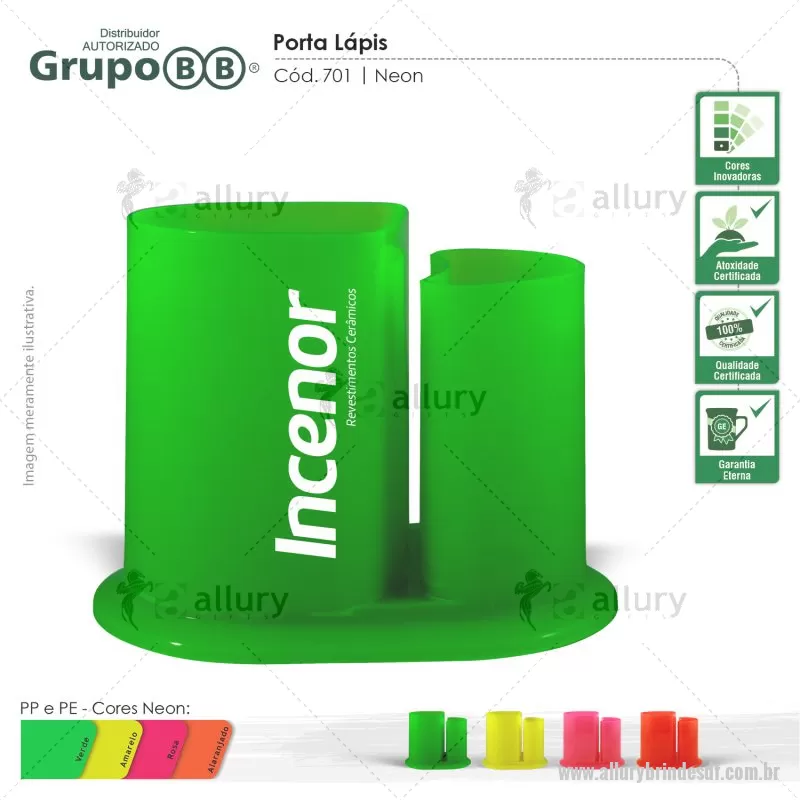 Porta Lápis com duas cavidades com espaço para cartão de visita. Seu design arredondado é de exclusividade do Grupo BB! Excelente brinde para escritórios e escolas. Cores Disponíveis - Linha Sólida: amarelo, branco, alaranjado, preto / Neon: Rosa, amarelo, verde, laranja / Metalizado: Azul, verde, vermelho, lilás, prata. Brinde ideal para feiras escolares e eventos corporativos. Personalização 1 cor. Outras opções sob consulta. Distribuidor Autorizado Grupo BB. - - ALLDFZ701