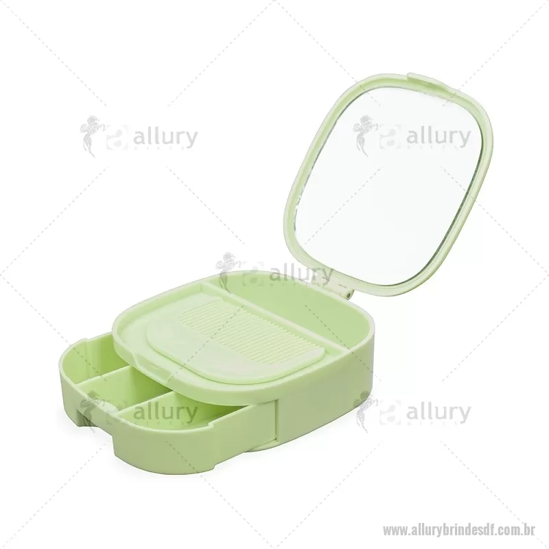 Porta-joias feito em plástico com espelho sem aumento na parte interna da tampa. Possui compartimentos internos de tamanhos variados e uma gaveta com três divisórias. Acompanha um pente compacto para cabelos. Altura : 3,5 cm x Largura : 9,9 cm x Comprimento : 9,9 cm Peso aproximado (g): 133 - - ALLDFFEM120