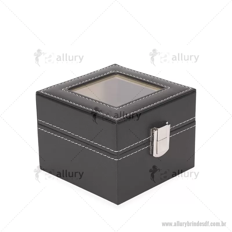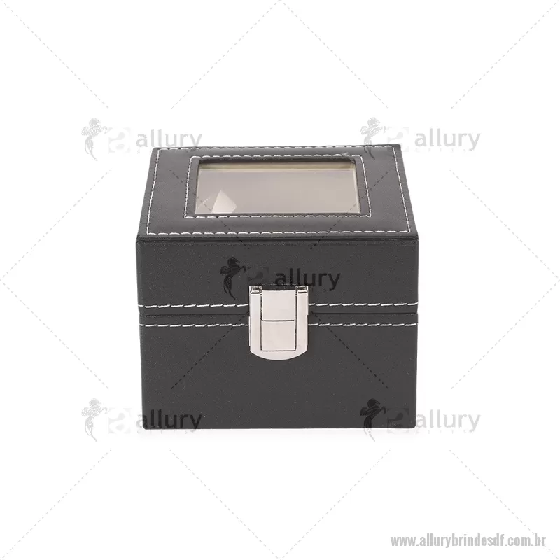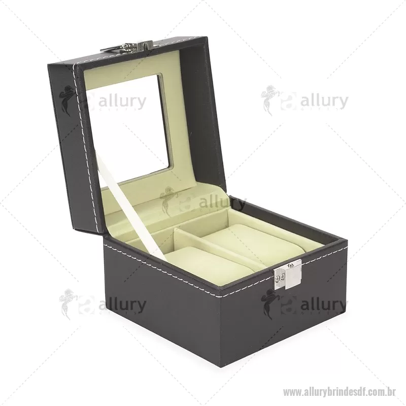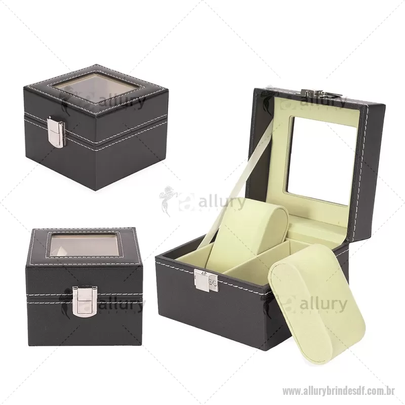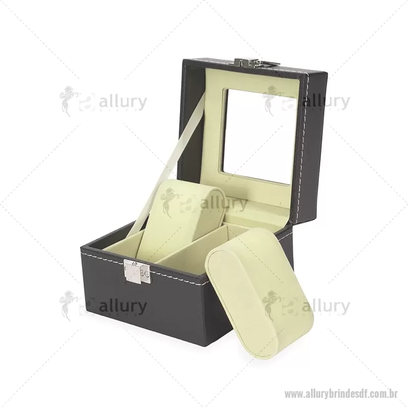 Porta relógios com acabamento externo em couro sintético à base de PVC e interior revestido em veludo macio. Possui duas divisórias com almofadas removíveis para melhor acomodação das peças, tampa com visor em vidro que facilita a visualização e trava de segurança que garante o fechamento adequado do estojo. Ideal para organizar e proteger relógios com elegância. - - ALLDFPREL001