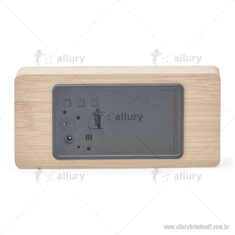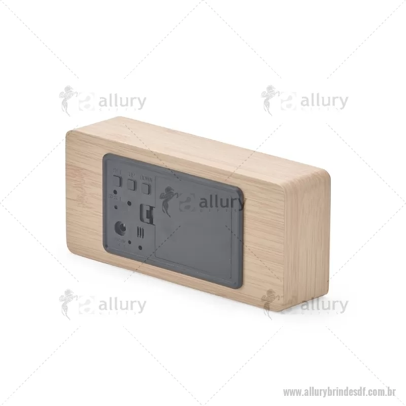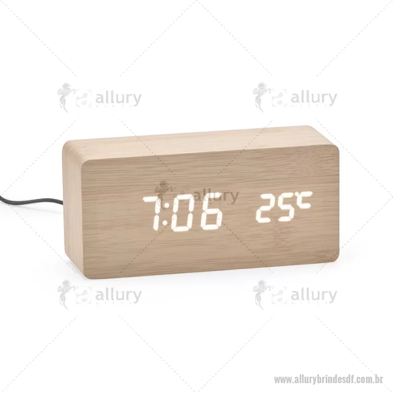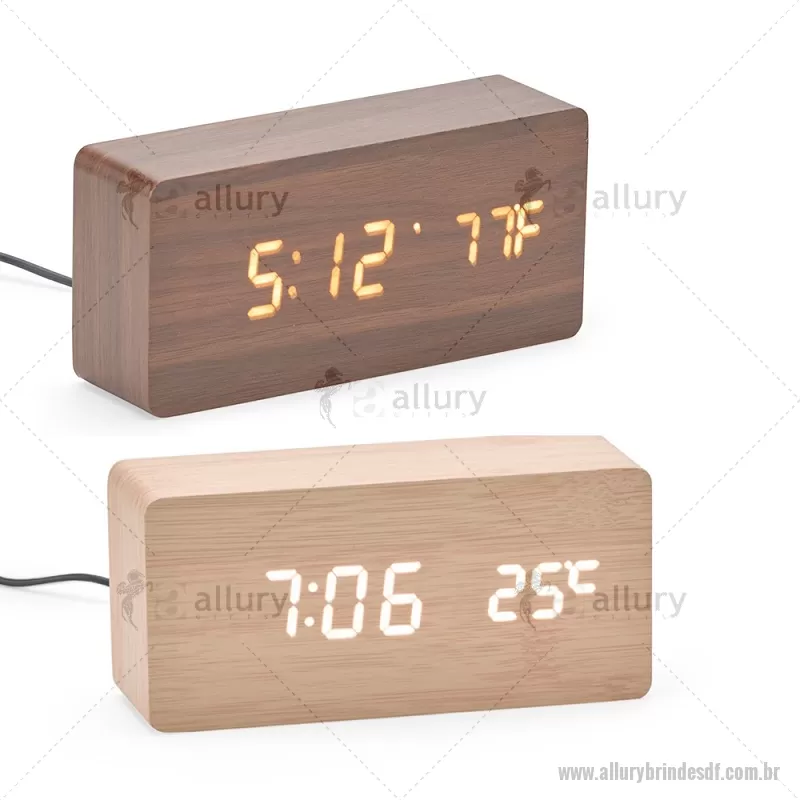Relógio despertador em madeira com display LED, que combina design elegante e tecnologia moderna. Exibe horas, data e temperatura ambiente, além de permitir a programação de até três alarmes com diferentes configurações. Pode ser alimentado por 4 pilhas AAA (não inclusas) ou por cabo USB DC 5V, que acompanha o produto, oferecendo praticidade para o uso diário. - - ALLDFREL023