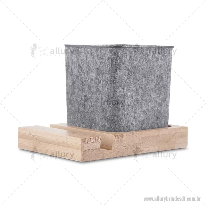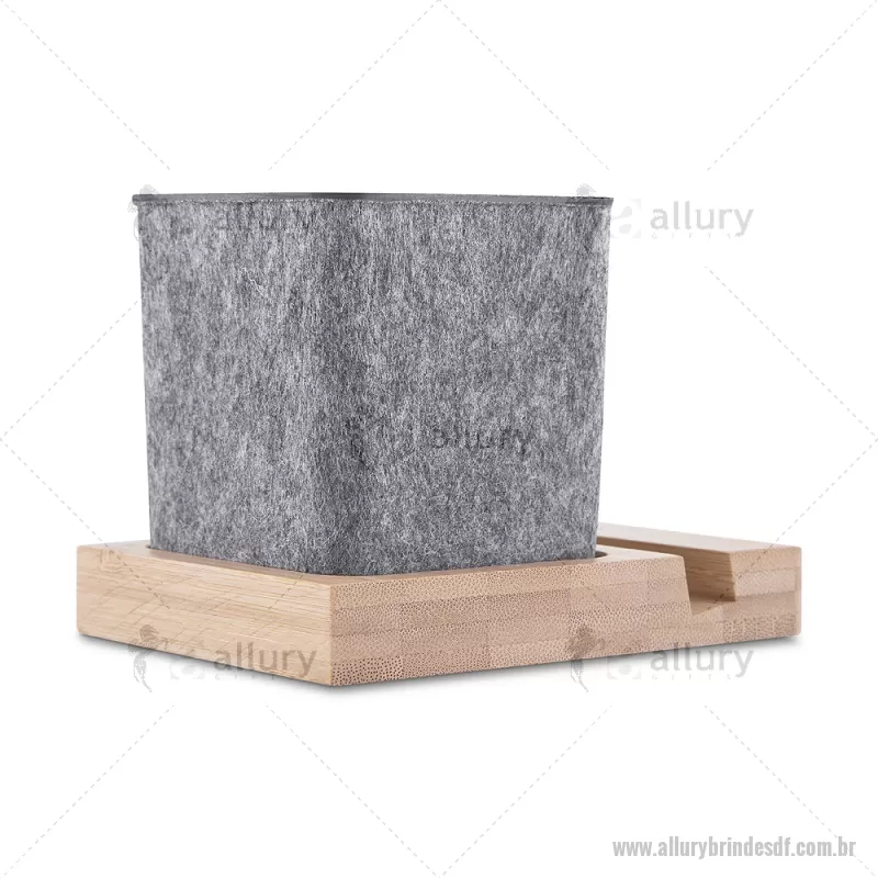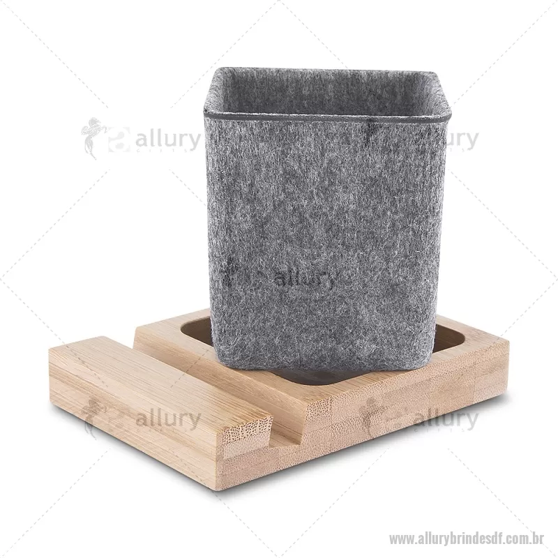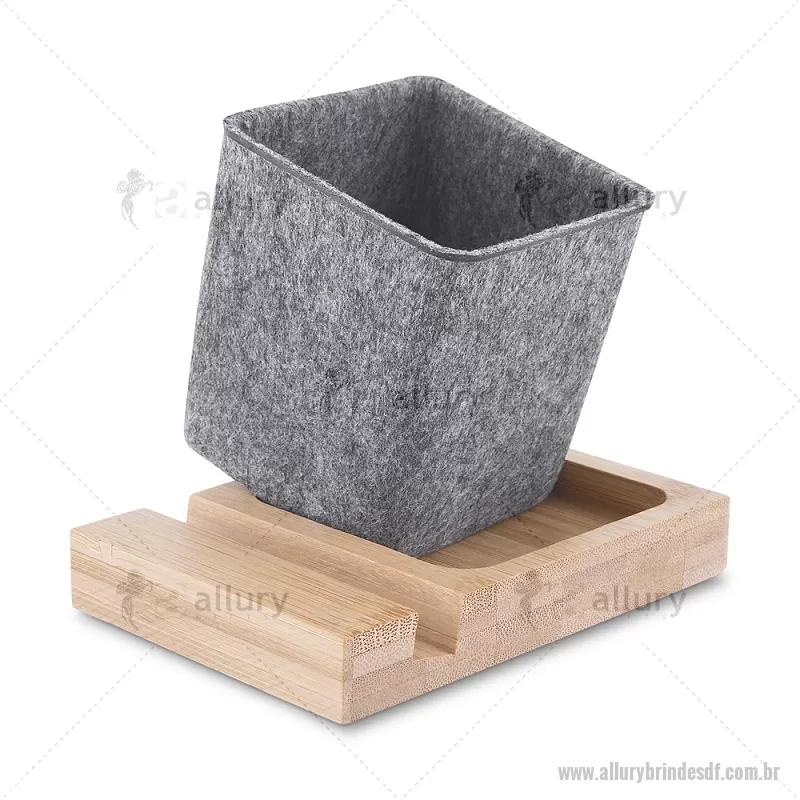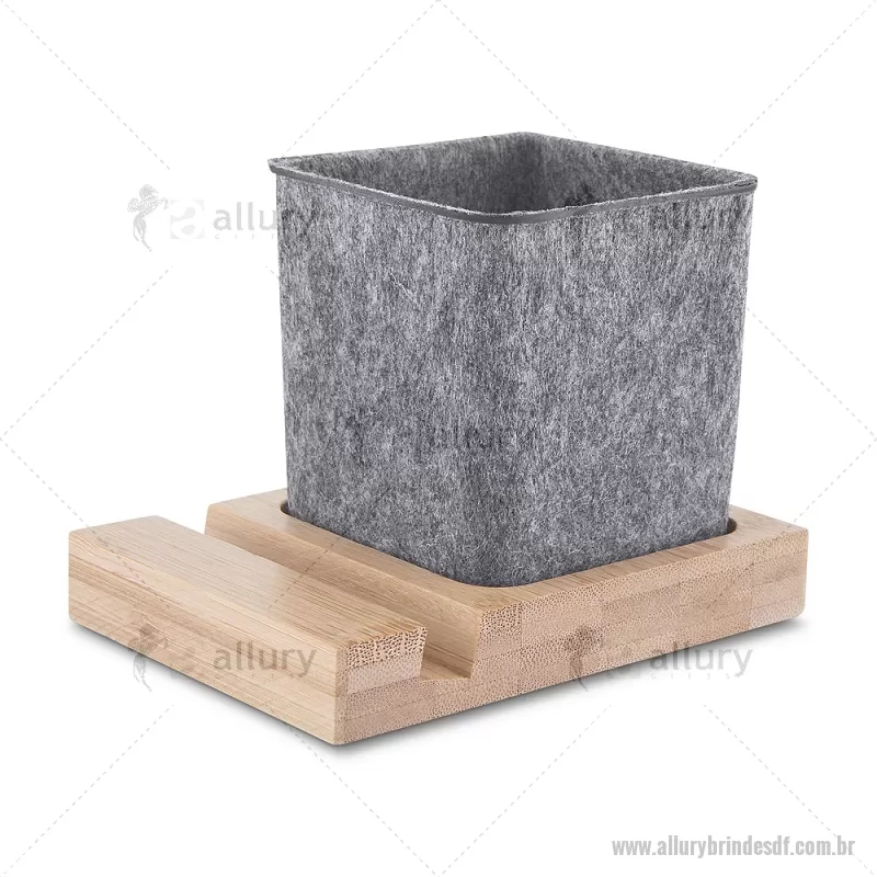 Porta objetos/smartphone em feltro e bambu Porta-objetos em feltro reciclado com suporte para celular em bambu. Prático e versátil, ideal para organizar canetas, lápis, marcadores e manter a mesa de escritório sempre funcional e elegante. Peso do Produto: 0,112kg Dimensão do Produto: (1,7x11,7x8,5cm) (Base em bambú) Dimensão do Produto: 8x6,5x6,5cm (Porta Caneta) - - ALLDFPC021